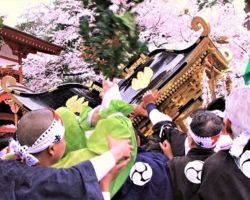 寺町と押上の若い衆が、一の神輿 二の神輿と呼ばれる二基の神輿をかつぎ 咲き始めた桜の中 助走をつけ激しくぶつかり合います。