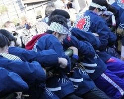 東町と西町の若衆が顔に隈取り(くまどり)を施し佐儀長(さぎのちょう)の歌を歌いながら竹を引き合い 今年の五穀豊穣や除災招福・家内安全を願います。