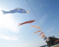 毎年5月、たくさんの鯉のぼりが青空を泳ぐ弁天岩。海の神様を祀った神社と灯台が併設された希少な観光スポットです。夕暮れトットコ岩とともに茜色に染まる弁天岩はいつまでも見ていたい景色です。